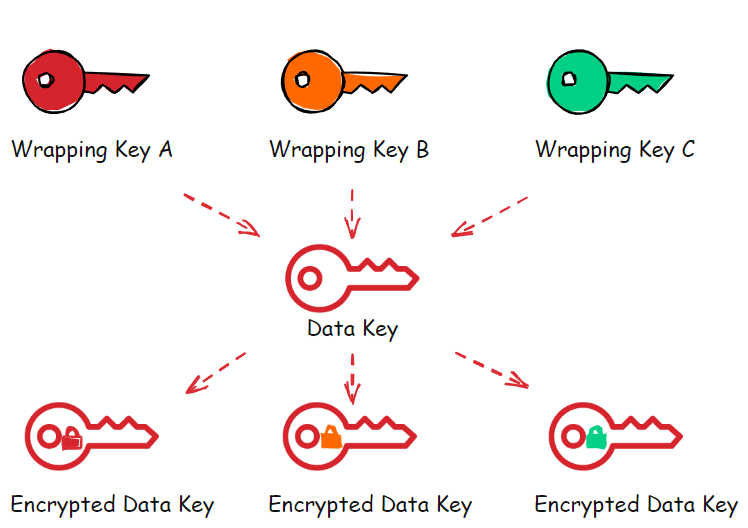 The security of your encrypted data depends in part on protecting the data key that can decrypt it. One accepted best practice for protecting the data key is to encrypt it. To do this, you need another encryption key, known as a key-encryption key or wrapping key. The practice of using a wrapping key to encrypt data keys is known as envelope encryption. See the images below for a visual explanation on enevelope encryption: